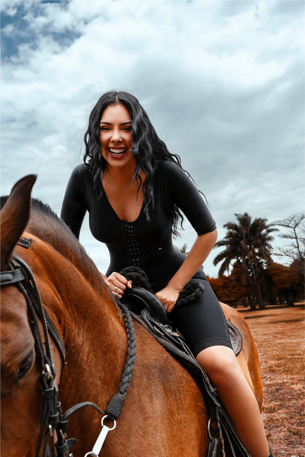 Faja de cuerpo completo con mangas 3/4 y largo hasta la rodilla. Compresión uniforme desde brazos hasta piernas. Disponible en colores negro clásico y cocoa cálido.