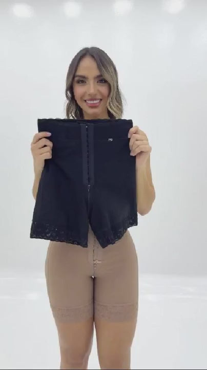 Panty faja de media pierna, con cintura alta y diseño tipo short. Cierre frontal con broches invisibles y sistema perineal funcional. Remates con encaje siliconado y estructura que se adapta al cuerpo sin generar marcas o molestias.